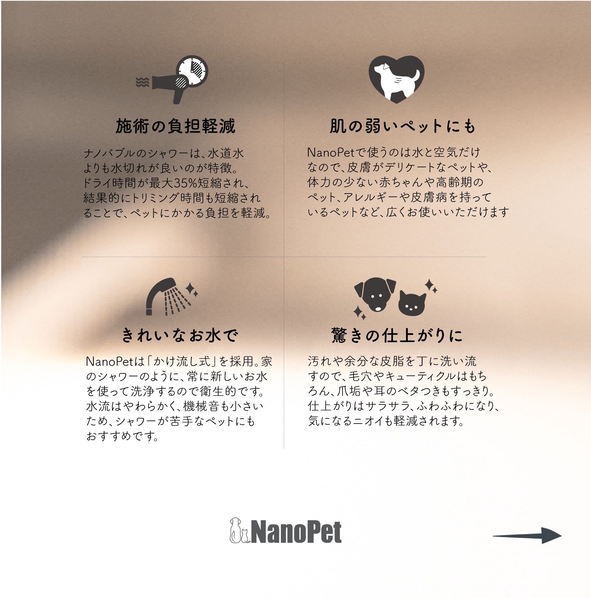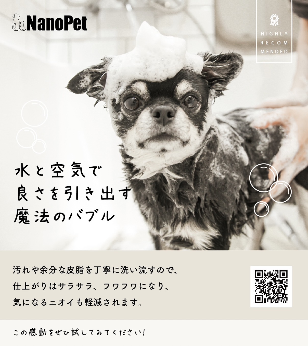 当店は、全犬種に魔法のバブルNanopetを使用しています。